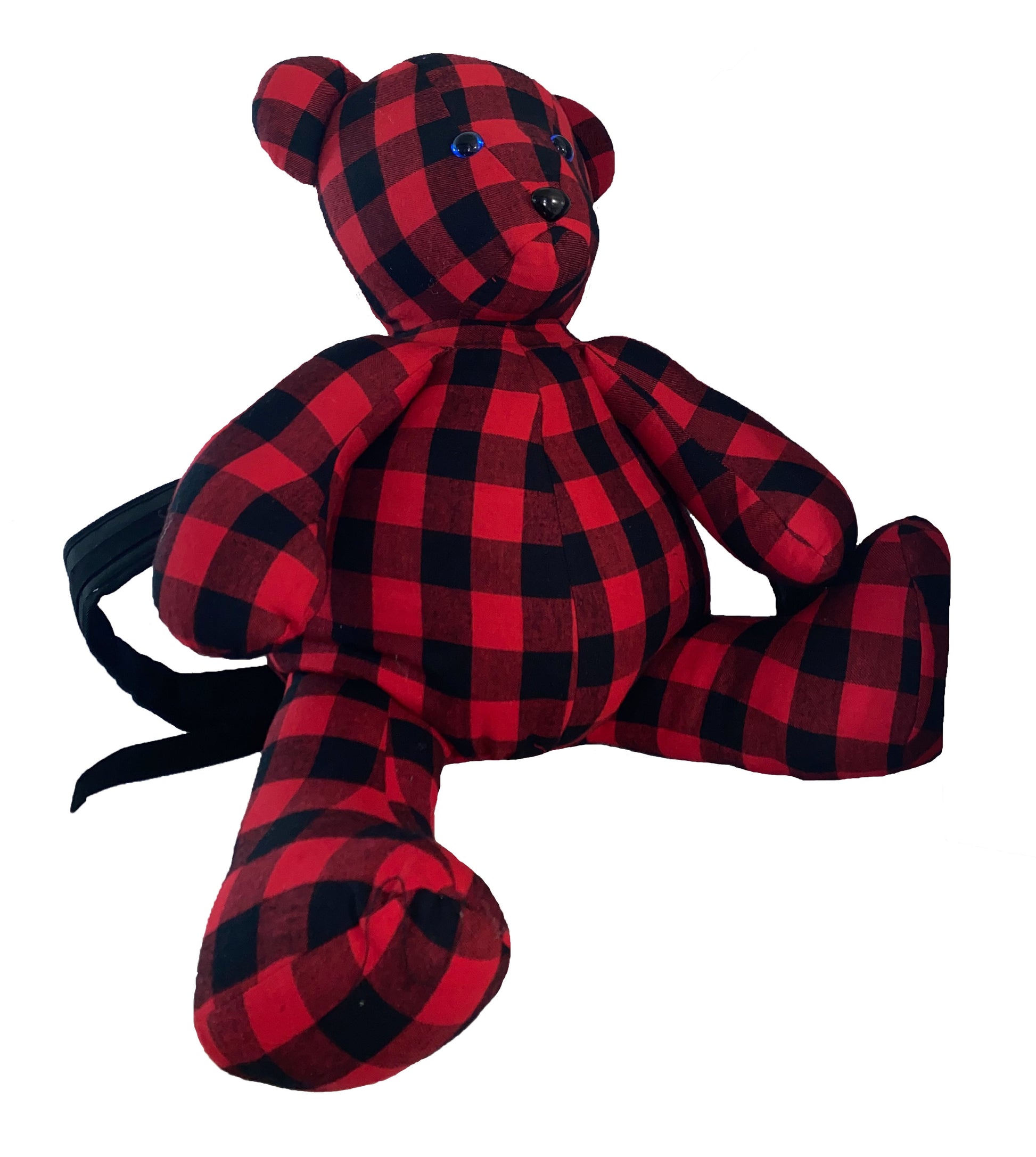 Backpack Stuffed Teddy Bears Red Plaid zipper at the back. Pouch can hold i.e, ipad, stationary, phone. Eyes color may change, blue, green brown. Back pack straps can clip on and off.
