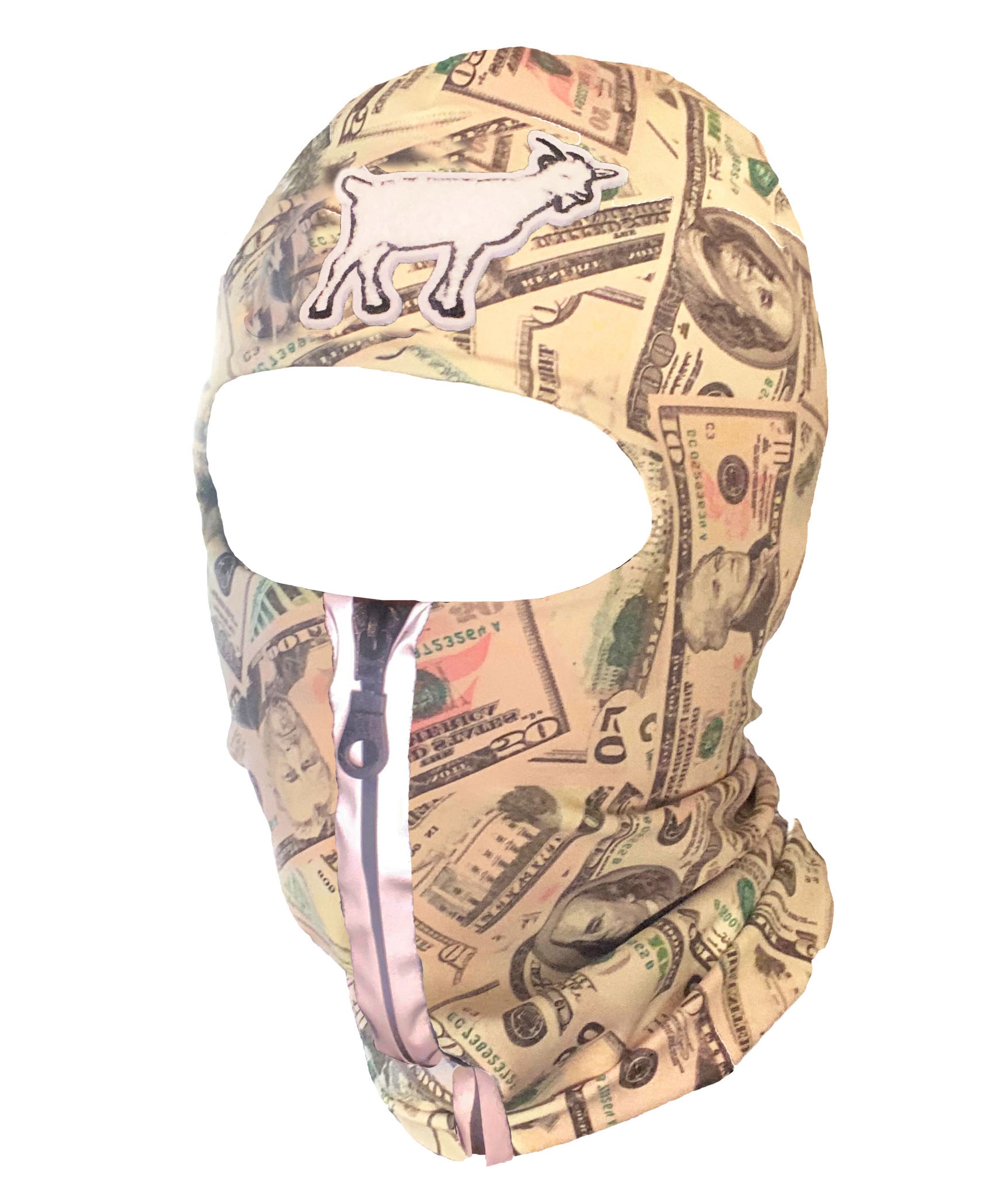 Fun Money Print Balaclava, with white goat emblem, ski mask. With reflective zipper, zipper color and style may change. One size fits all, its stretchy. Double layered spandex.